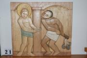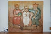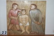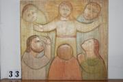 Abstract: Quadro in rilievo scolpito in legno e parzialmente dipinto: raffigurazione della benedizione con l'olio santo.