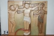 Abstract: Rilievo in legno intagliato e parzialmente dipinto: raffigurazione di Gesù crocifisso insieme ai ladroni. La madre di Gesù, Maria, si piega davanti a lui.
