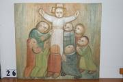 Abstract: Rilievo in legno intagliato e parzialmente dipinto: raffigurazione di Gesù in tunica bianca con braccia sollevate e stimmate sulle mani, circondato da otto figure, i suoi discepoli.