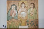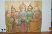 Abstract: Quadro in rilievo scolpito in legno e parzialmente dipinto: rappresentazione del battesimo. Nel mezzo c'è il sacerdote con un bambino battezzato, che è trattenuto da padre e madre.