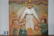 Abstract: Rilievo in legno intagliato e parzialmente dipinto: l'immagine della resurrezione di Gesù davanti alla tomba aperta, con la croce nella mano sinistra e la mano destra sollevata nel segno della pace. Stimmate su mani e piedi. Alla sua destra una figura seduta con la testa reclinata verso il basso, a sinistra una figura che si allontana da lui.