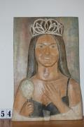 Abstract: Rilievo in legno intagliato e parzialmente dipinto: ritratto a mezzo busto di Miss Italia 2000.