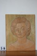 Abstract: Quadro a rilievo in legno intagliato e parzialmente dipinto: ritratto a mezzo busto di Marilyn Monroe.
