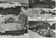 Abstract: Cartolina illustrata raffigurante tre illustrazioni in bianco e nero: a sinistra, l'Hotel Waldheim durante la stagione invernale; in alto a destra, la pista da sci; in basso a destra, il paese di Sesto.