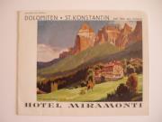 Abstract: Depliant: "Hotel Miramonti" pr. S. Costantino presso Siusi allo Sciliar; all'interno, le fotografie dell'hotel e del laghetto di Fiè di L. Bährendt. Edizione per l'estero. Motivo: illustrazione dell'hotel e del paesaggio montano estivo circostante (di Franz Lenhart).