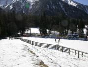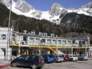 Abstract: Biathlonzentrum in Antholz- Obertal: Parkplatz vor dem Hauptgebäude mit Bar, Restaurant und Skiverleih