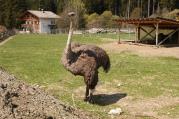 Abstract: Vogel Strauß auf einer Wiese, im Hintergrund ein Haus