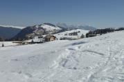Abstract: Blick von Kompatsch über verschneite Wiesen Richtung Schlern