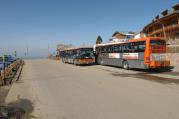 Abstract: Zwei geparkte Autobusse am Straßenrand in Kompatsch