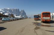 Abstract: Blick von Kompatsch auf den Schlern, rechts am Straßenrand geparkte Autobusse, links ein Parkplatz
