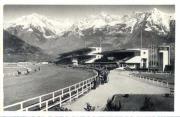 Abstract: Pferderennen in Meran, mit zahlreichen Zuschauern, gegen Tribünen.