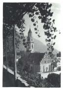 Abstract: Gesamtansicht der Pfarrkirche zum Hl. Nikolaus von einer Weinlaube am Tappeinerweg.