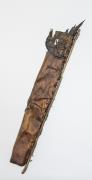 Abstract: La faretra è formata da una sacca in pelle dalla forma rettangolare e allungata e da un'asticciola in legno di nocciolo per renderla più resistente. Il pezzo di pelle è stato piegato nel senso della lunghezza e cucito con punti a sopraggitto mediante una striscia incuoio. Per il rinforzo è stato utilizzata un'asticciola in legno di nocciolo nella parte longitudinale. Questa serviva a proteggere le frecce da eventuali danni. L'apertura della faretra è molto rovinata.