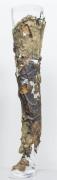 Abstract: Il gambale destro è stato realizzato cucendo insieme pezzi irregolari di pelle di capra domestica (Capra hircus). Nella parte inferiore si trova una linguetta di pelle di cervo. Questo gambale nonostante sia piuttosto frammentato, è conservato discretamente. Sul margine superiore è ancora preservato parte del laccio di cuoio, che aveva lo scopo di stringere il gambale sulla cintura.